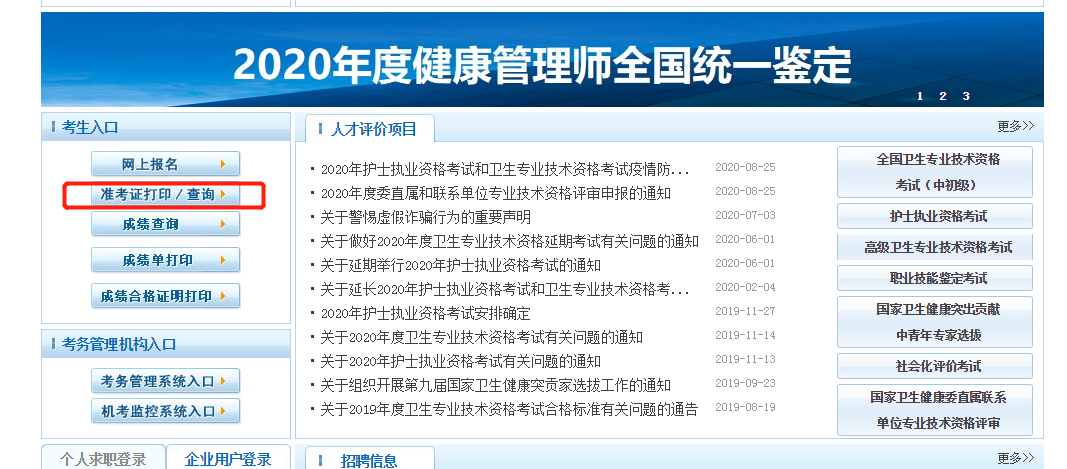 如何打印2020年健康管理师考试准考证?