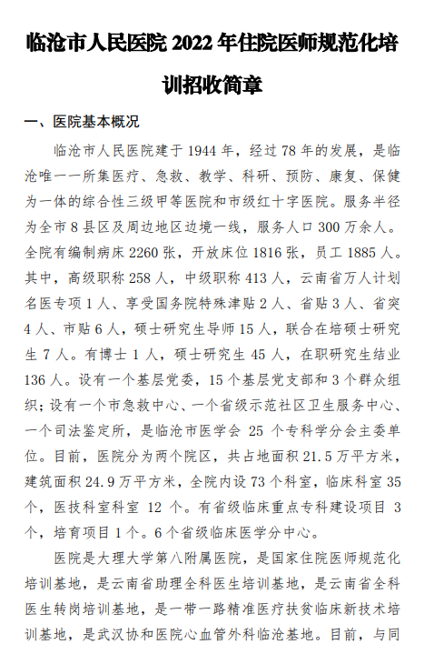 临沧市人民医院2022年住院医师规范化培训招收简章