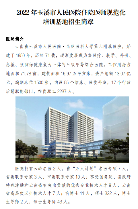 2022年玉溪市人民医院住院医师规范化培训基地招生简章