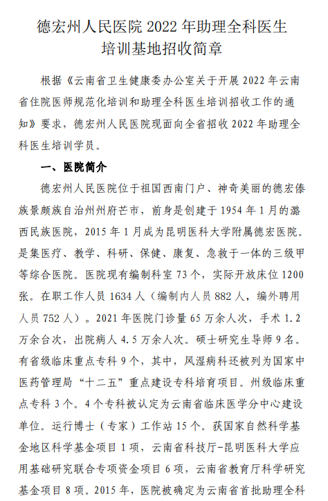 德宏州人民医院2022年助理全科医生培训基地招收简章