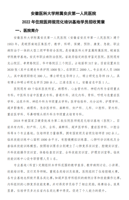 安庆市第一人民医院2022年住院医师规范化培训招生简章