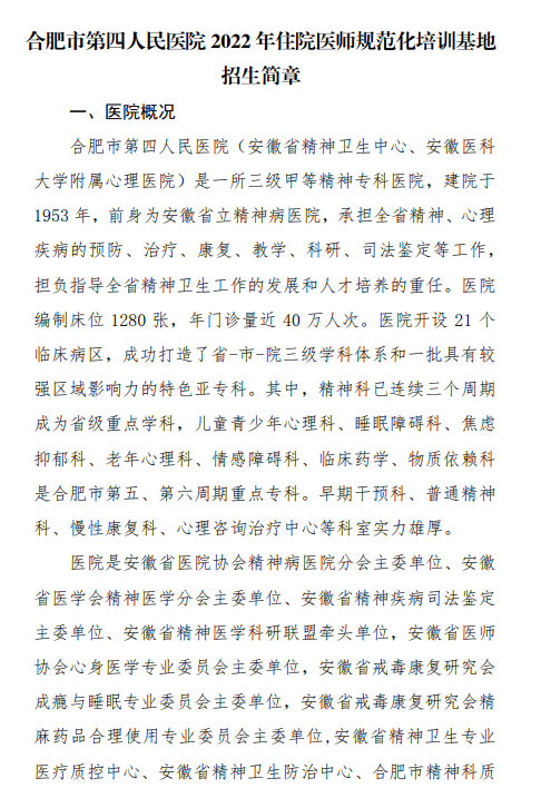 合肥市第四人民医院2022年住院医师规范化培训招生简章