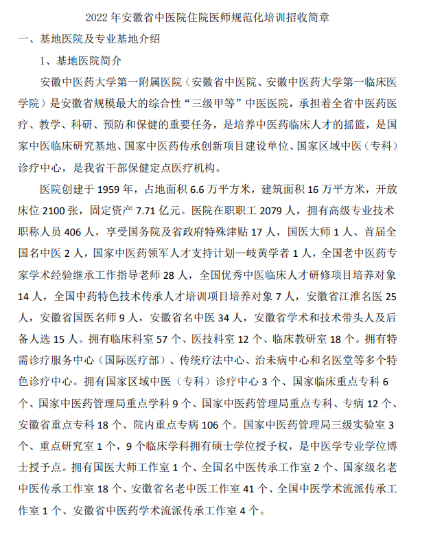 安徽省中医院2022年住院医师规范化培训招生简章