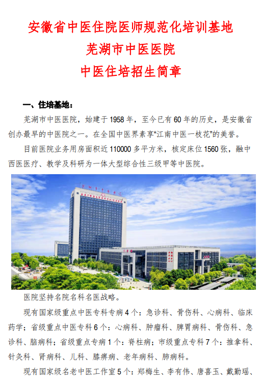 芜湖市中医医院2022年住院医师规范化培训招生简章
