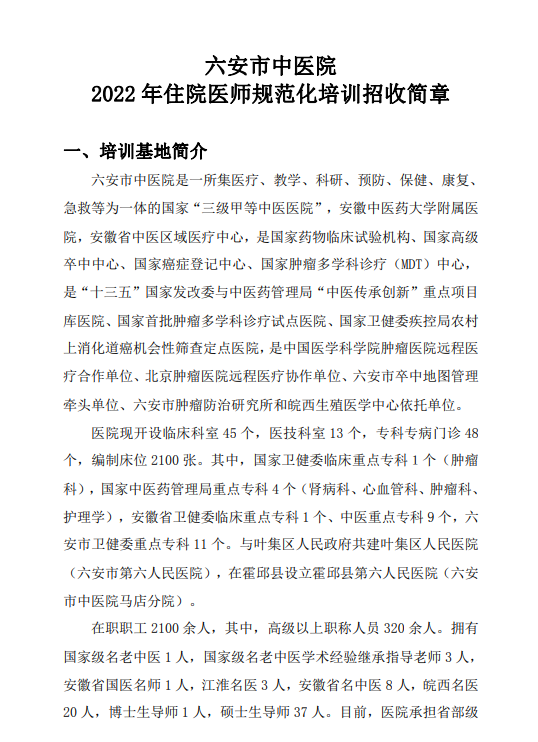 六安市中医院2022年住院医师规范化培训招生简章