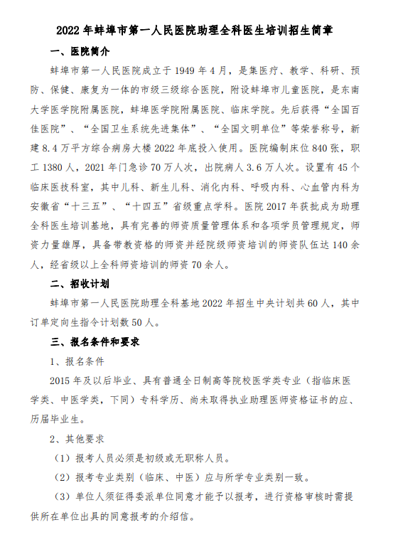 蚌埠医学院第二附属医院2022年住院医师规范化培训招生简章