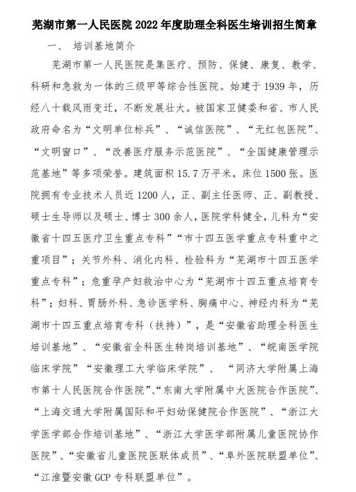 芜湖市第一人民医院2022年住院医师规范化培训招生简章