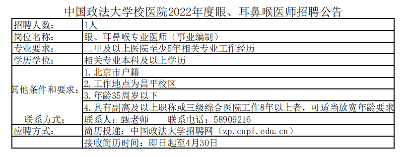 中国政法大学校医院2022年眼、耳鼻喉医师招聘1名