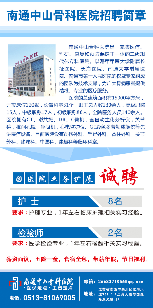 江苏省南通中山骨科医院2022年招聘工作人员10名