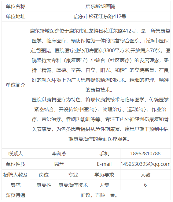 江苏省南通市启东新城医院招聘康复治疗技术人员6名