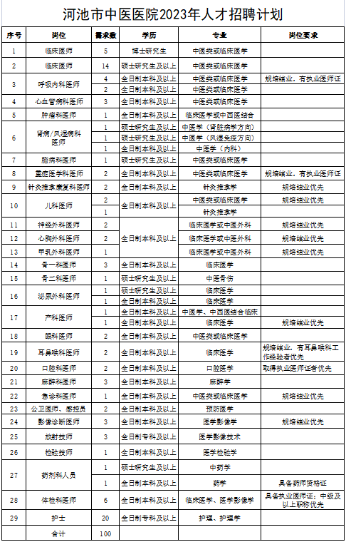 广西河池市中医医院2023年招聘各类人才100名