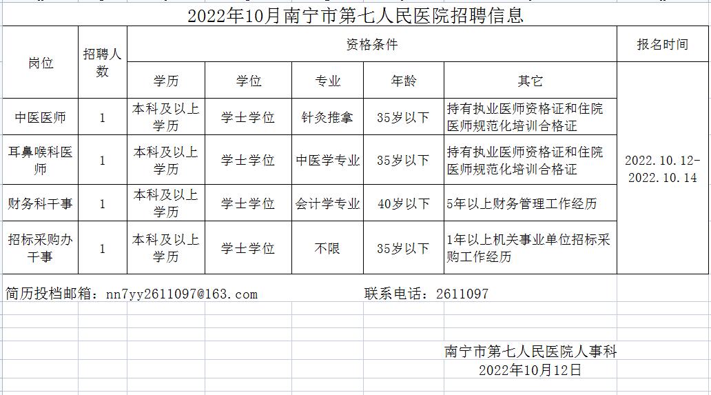 南宁市第七人民医院2022年10月招聘工作人员4人