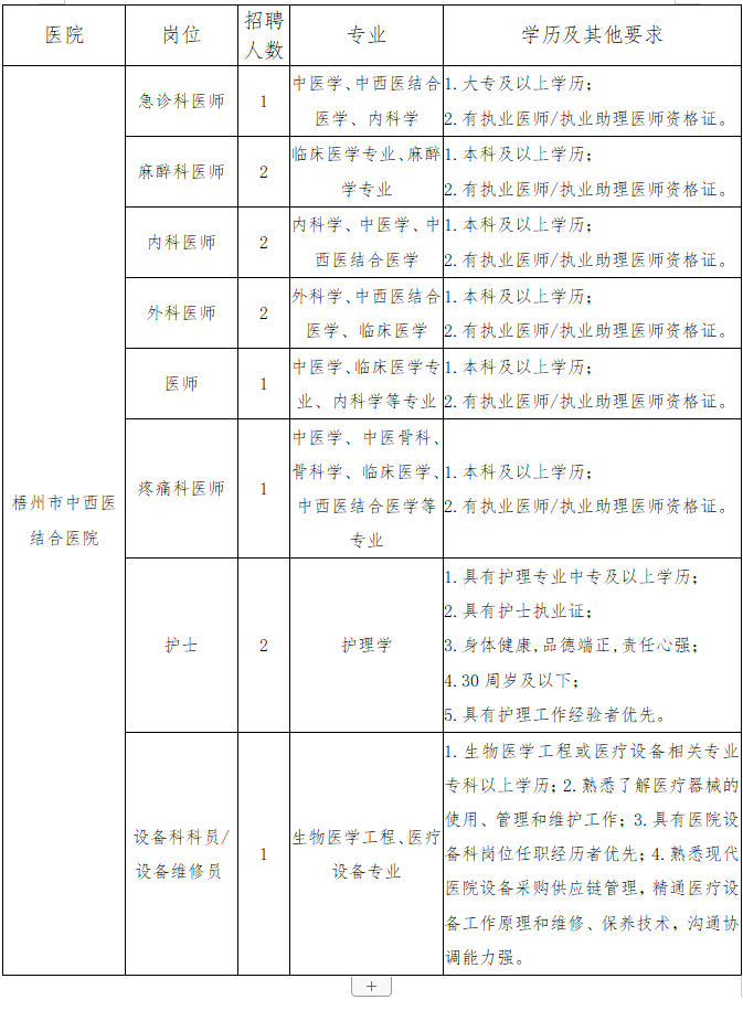 广西梧州市中西医结合医院2022年招聘医师、护士等12名
