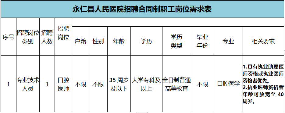 云南省楚雄州永仁县县域医共体人民医院招聘合同制口腔医师1名