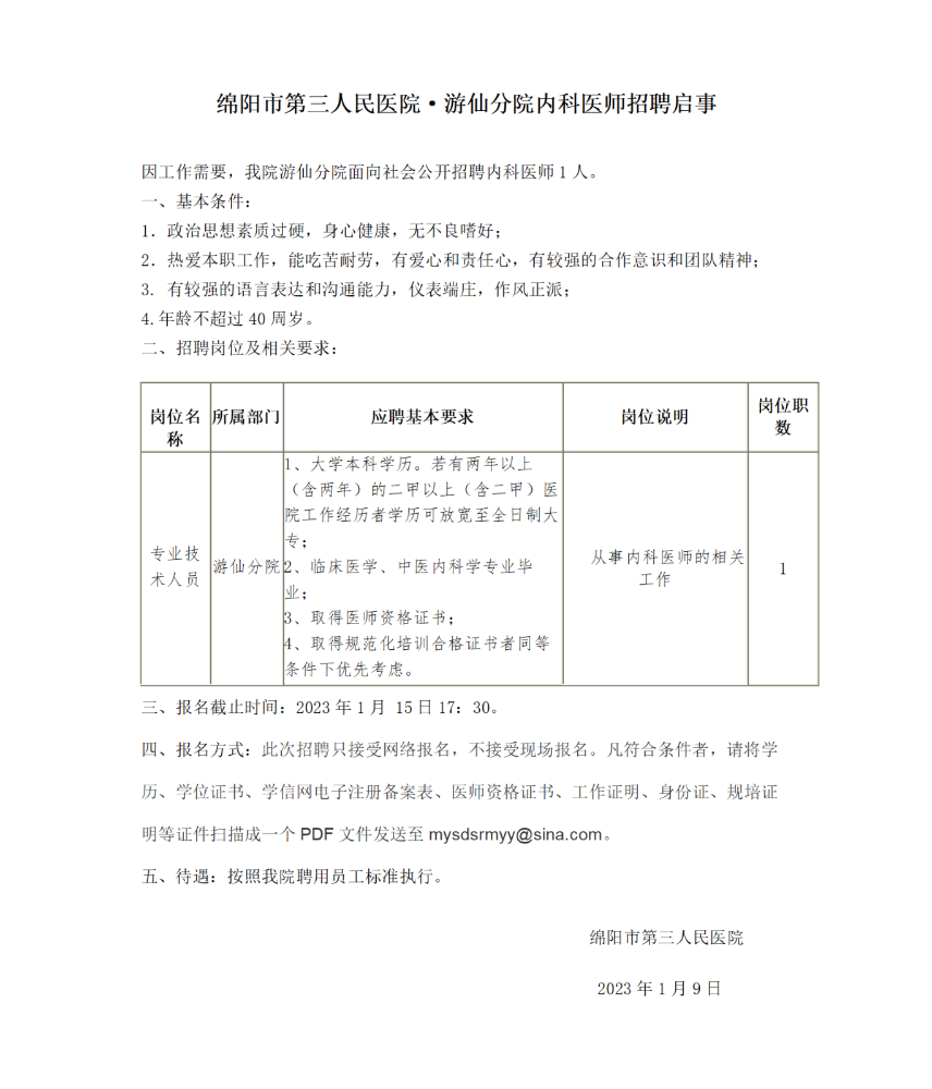 绵阳市第三人民医院游仙分院招聘内科医师1人