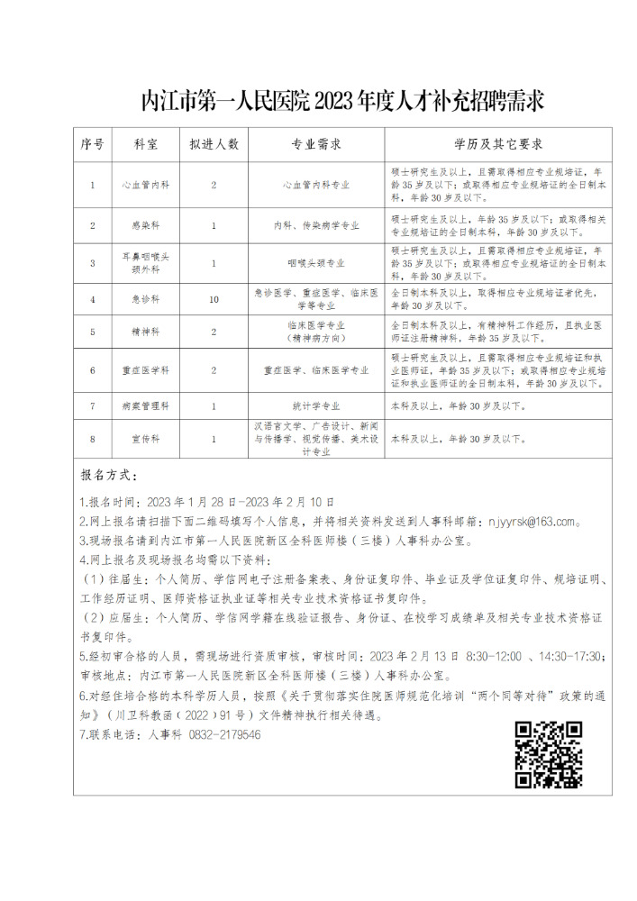 四川省内江市第一人民医院2023年人才补充招聘20人