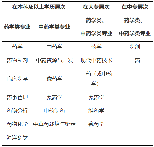 报考条件中要求的“药学类、中药学类专业”,按照国务院学位委员会、教育部印发的《学位授予和人才培养学科目录设置与管理办法》《普通高等学校高等职业教育(专科)专业设置管理办法》和《学位授予和人才培养学科目录》《普通高等学校本科专业目录(2012年)》《普通高等学校高等职业教育(专科)专业目录(2015年)》等规定,对照学科目录来界定。