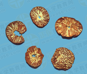 饮片槟榔:呈类圆形的薄片。切面可见棕色种皮与白色胚乳相间的大理石样花纹。气微,味微涩、微苦。