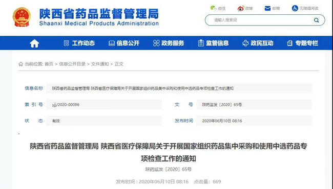 6月10日,陕西省药品监督管理局联合省医疗保障局,印发了《关于开展国家组织药品集中采购和使用中选药品专项检查工作的通知》。
