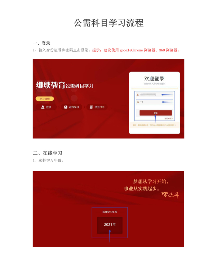 附件:公需科目学习流程(说明:此公需科目为省内开展的学习,目前仅支持电脑端学习,手机端学习另行通知。另,此前国培网(app)已停止学习使用。)