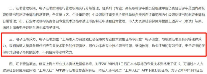上海明确表示:电子证书加盖“上海市人力资源和社会保障局专业技术资格证书专用章”电子印章,与纸质证书具有同等法律效力,表明持证人员具备担任相应专业技术职务的任职资格,可作为本市专业技术职务评聘、继续教育、执业注册的有效凭证。