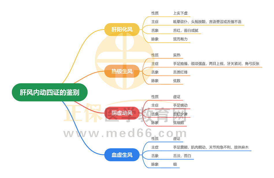 2024年中西医执业医师考试中,中医诊断学除了考基础内容,还考察到了病例分析题,主要是八纲辨证中辨证论治的内容,逐渐突出侧重临床的方向。医学教育网小编为大家整理“肝风内动四证的鉴别”考点思维导图供大家复习: