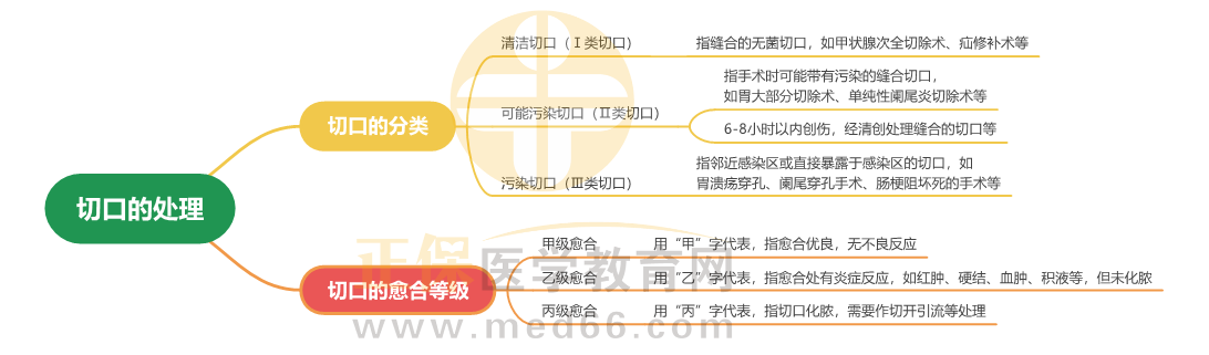 2024年中西医执业医师考试中,中西医外科学的考察重点跟中西医内科学相似,西医治疗、中医辨证论治为首要。需要特别注意的是诊断标准中涉及的数值和各项标准需特别记忆。医学教育网小编为大家整理“切口的处理”考点思维导图供大家复习: