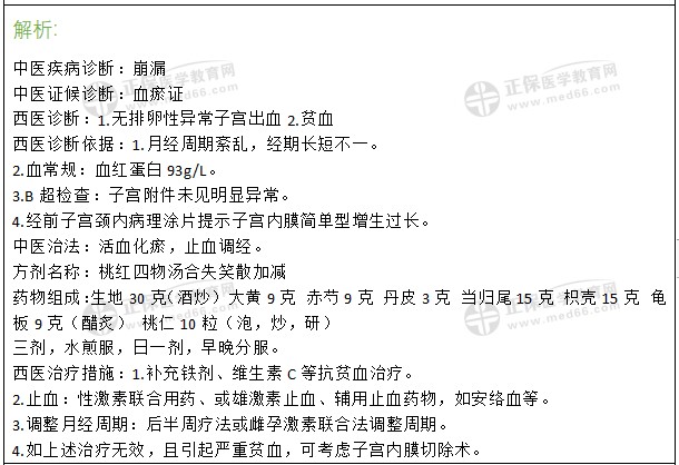 历年考生回忆版考试题目:张某,女,50岁,已婚,职员。2016年1月12日初诊。患者9个月前经期淋雨涉水后,连月来出现月经周期紊乱,经期5~20天,经量多少不定,经闭3个月后于2016年1月1日骤然而下,淋沥不断,色暗质稠,夹有血块,小腹刺痛。妇科检查:宫颈光滑,腔内流出暗红色血液,子宫及双侧附件正常。辅助检查:血常规:血红蛋白93g/L,B超检查:子宫附件未见明显异常。经前子宫颈内病理涂片提示:子宫内膜简单型增生过长。要求:根据上述摘要,在答题卡上完成书面分析。