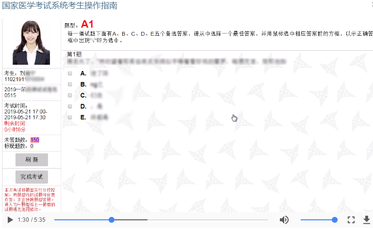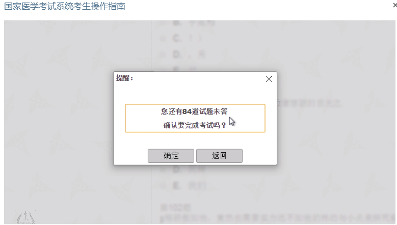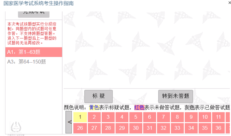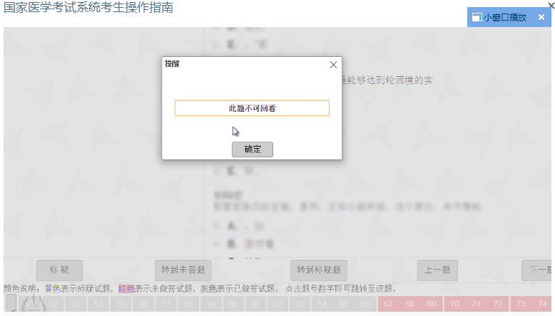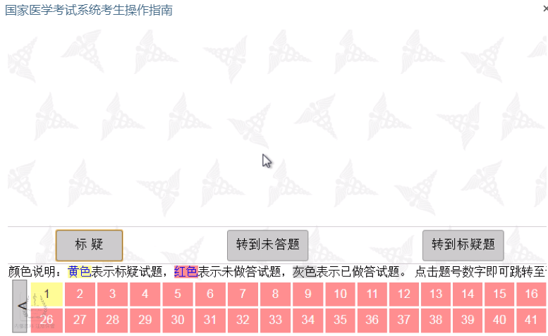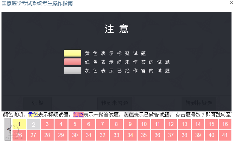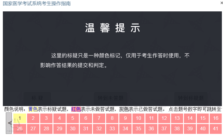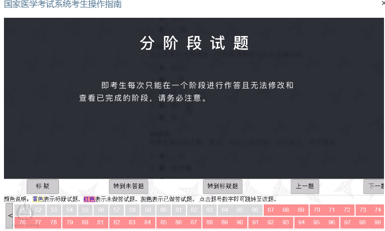 跨题型不可回看:医师资格考试按照题型实行分段控制,同题型内的试题可以任意作答,不支持跨题型答题。进入下一题型后上一题型的试题将无法再次修改!