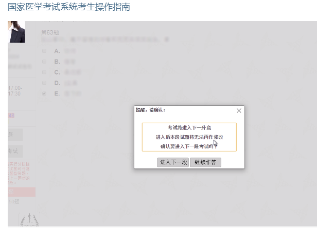 进入下一分段时,页面会有弹框提示,考试将进入下一分段,进入后本段试题将无法再做修改,确认要进入下一段考试吗?所以大家一定要在做完一个阶段的题目之后,认真检查确认无误之后,在进入下一段的考试题目。