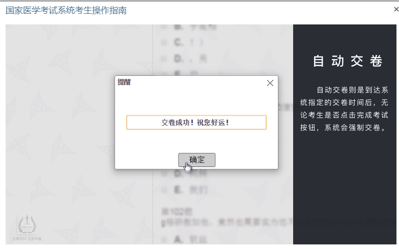 交卷方式:试卷分为考生手动交卷和系统自动交卷两种方式。自动交卷是指考试时间到了即使还未作答完毕,系统强制交卷。手动交卷是指答题结束,考试时间还没有到,可以手动点击“完成考试”交卷。所以大家在答题的时候一定要注意看左侧的剩余时间。