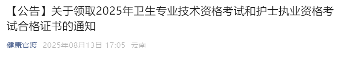 2025年度卫生专业技术资格考试及护士执业资格考试合格证书已可以领取。凡在官渡区卫生健康局报名审核点(官渡街道社区卫生服务中心)进行现场审核的考生,请按以下要求领取证书: