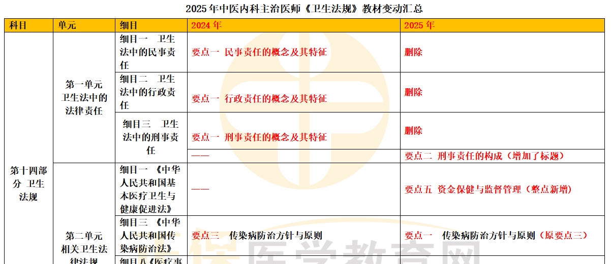 2025年中医内科主治医师《卫生法规》教材变动汇总