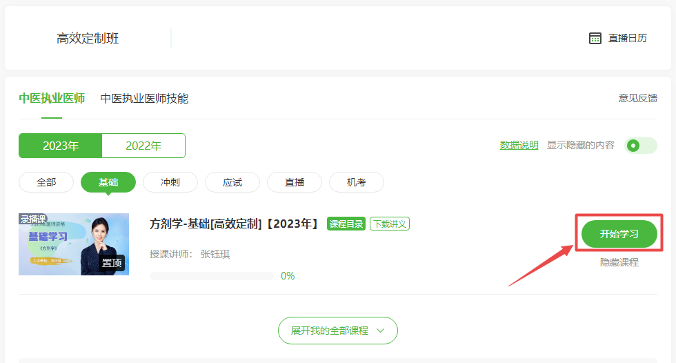 登录学员代码进入我的网校我的家,点击“我的课程”,进入课程,选择“2023年”,即可看到《方剂学》课程,点击开始学习即可。