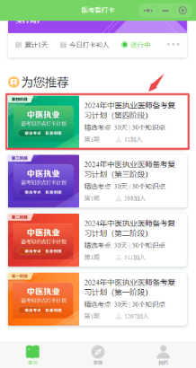 请选择“您的备考计划”,如中医执业医师备考复习计划(第四阶段),然后点击下方“加入计划开始学习”按钮,开始正式进入打卡学习;