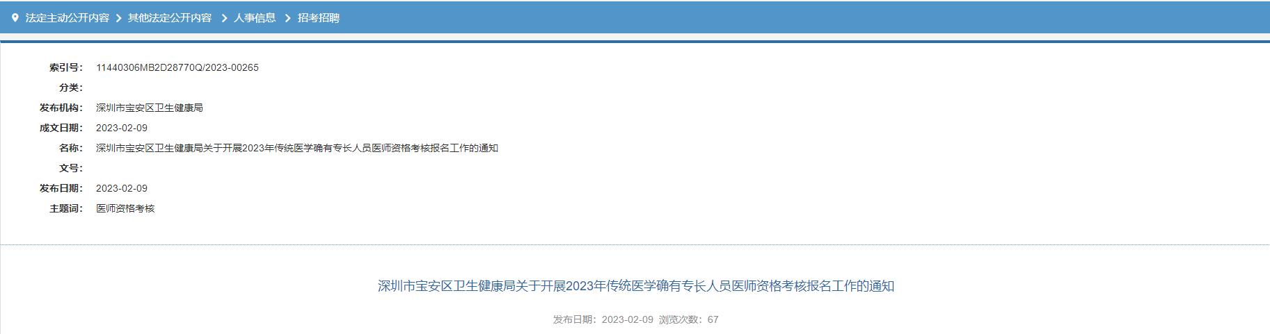 深圳市宝安区卫生健康局关于开展2023年传统医学确有专长人员医师资格考核报名工作的通知