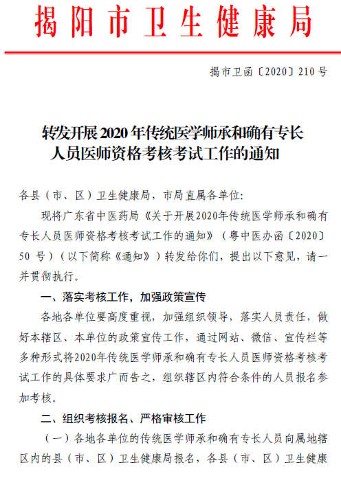 揭阳市转发开展2020年传统医学师承和确有专长人员医师资格考核考试工作的通知如下:
