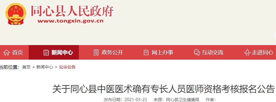 报名时间:2021年3月25日至4月20日。地点:同心县卫生健康局三楼中医药管理岗。根据《宁夏回族自治区中医医术确有专长人员医师资格考核注册管理实施细则(暂行)》有关规定,为做好我县中医医术确有专长人员医师资格考核组织管理工作,现将2021年同心县中医医术确有专长人员医师资格考核报名相关事宜通告如下: