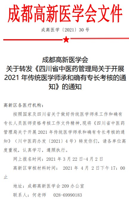 成都高新医学会2021年传统医学师承和确有专长考试报名通知