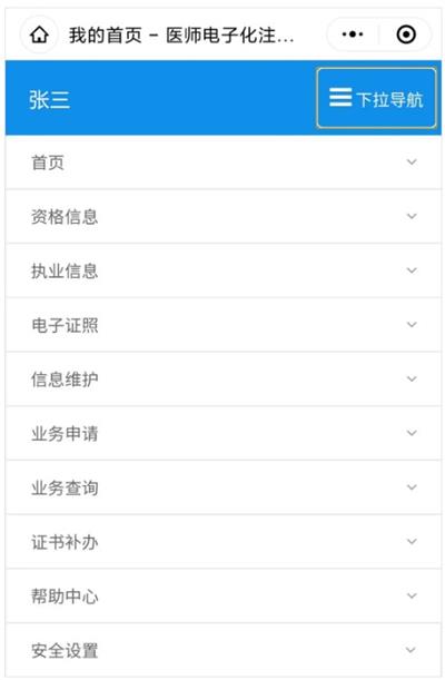3、在医师个人端,点击右上角【下拉导航】中的【业务申请】