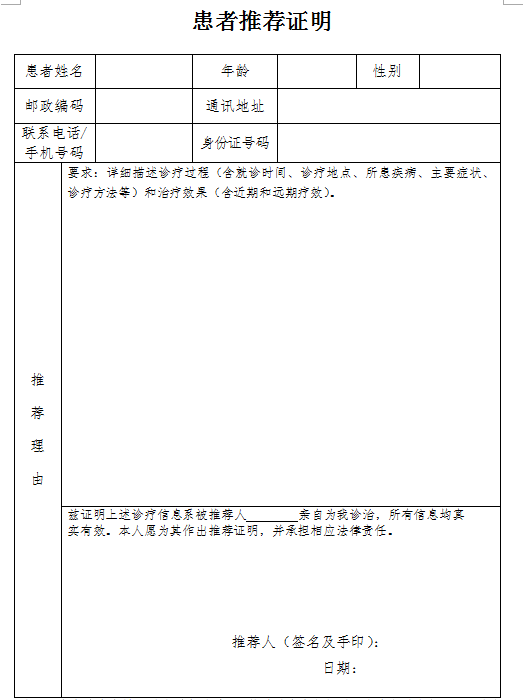 注:1.患者诊疗资料以附件形式附后;2.推荐的患者须提供本市常住的身份证明(身份证、居住证等),复印件附后;3.儿科患者等特殊推荐人如无完全民事行为能力的 ,可以由其监护人代为签名及手印。
