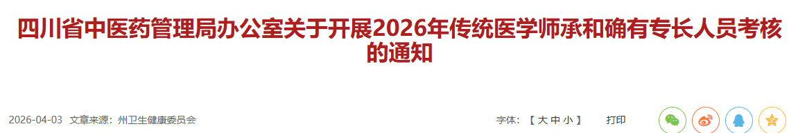 按照《传统医学师承和确有专长人员医师资格考核考试办法》(卫生部第52号令)和《四川省中医药管理局关于做好传统医学师承工作和确有专长人员医师资格考核工作的通知》(川中医药办发〔2009〕55号),现将2026年传统医学师承和确有专长人员考核有关事宜通知如下。