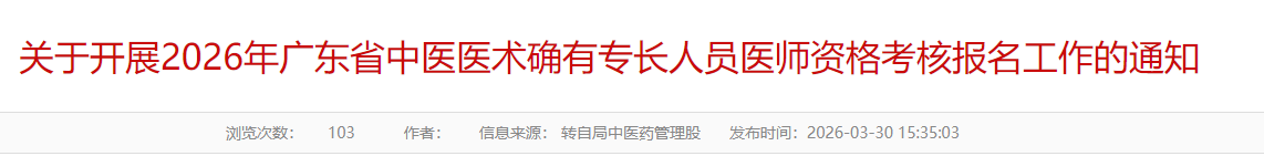 根据广东省中医药局《关于开展2026年广东省中医医术确有专长人员医师资格考核报名工作的通知》(粤中医办函〔2026〕9号,以下简称省文件,附件1)以及梅州市卫生健康局《关于开展2026年广东省中医医术确有专长人员医师资格考核报名工作的通知》(梅市卫中医函〔2026〕2号,附件2)文件要求,结合我市实际,现将有关事项通知如下: