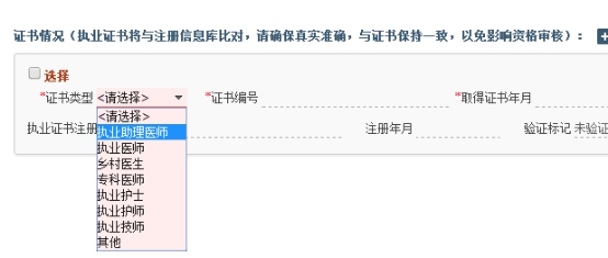 助理升执业的考生,必须在下图中选择“执业助理医师”,证书编号即医师资格证书编号,所有信息准确填写后,勾选左上角的“选择”。