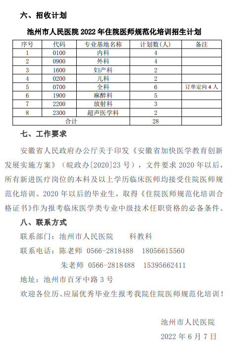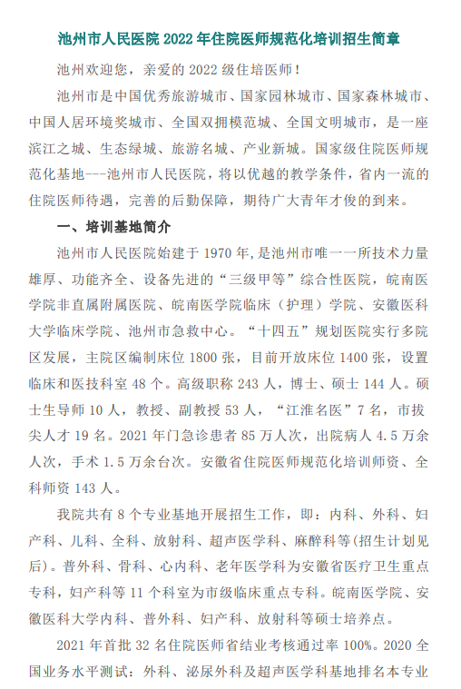 相关附件:池州市人民医院2022年住院医师规范化培训招生简章
