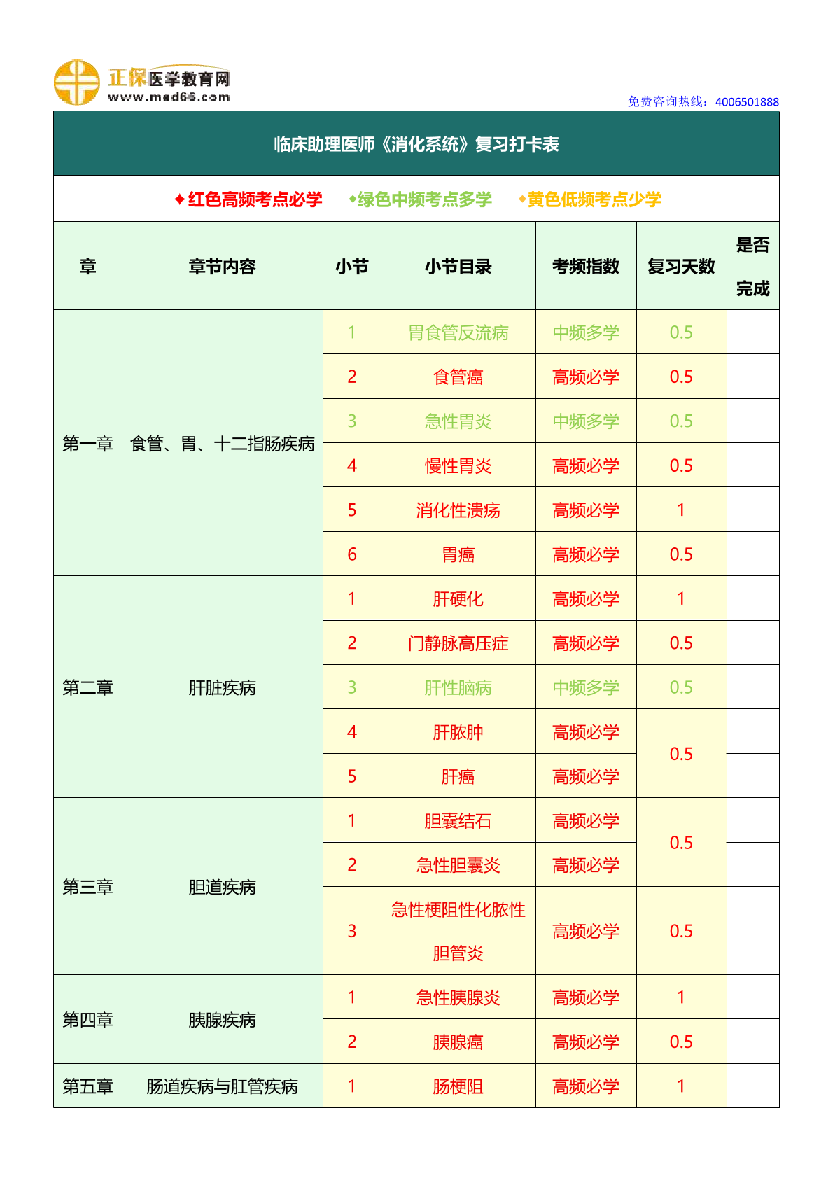 2026年临床助理医师《三色复习打卡表》